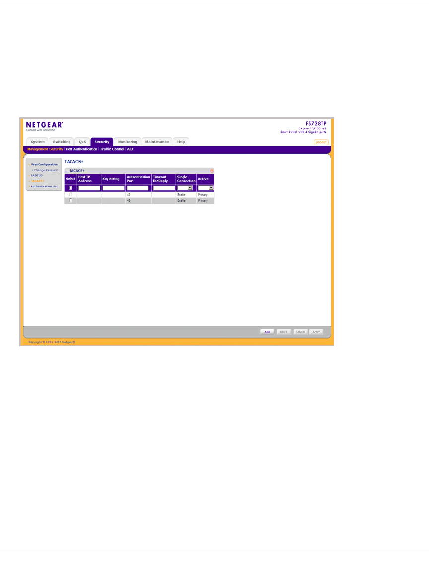 1. Click Security > Management Security > TACACS+. The TACACS+ screen displays: