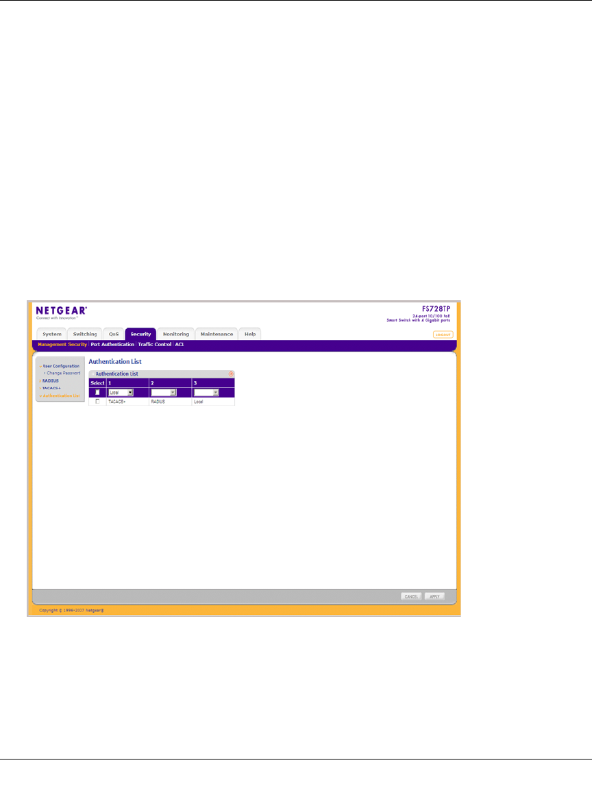 1. Click Security > Management Security > Authentication List. The Authentication List