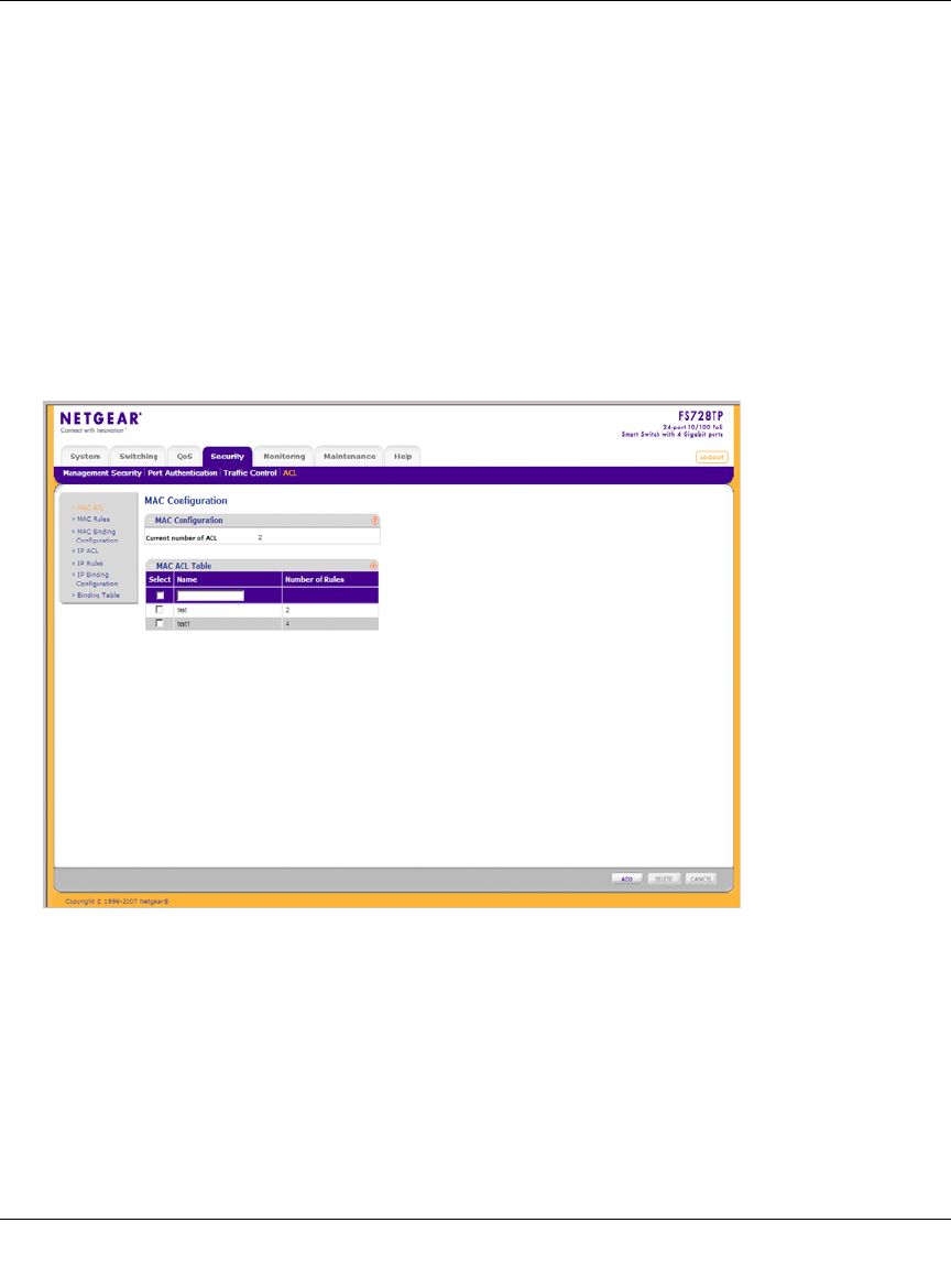 1. Click Security > ACL > MAC ACL. The MAC Configuration screen displays:
