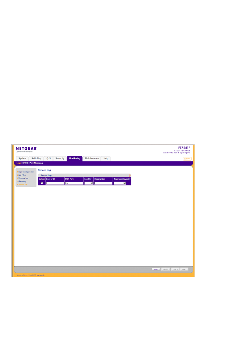 The Server Log screen contains information for viewing and configuring the remote log servers.