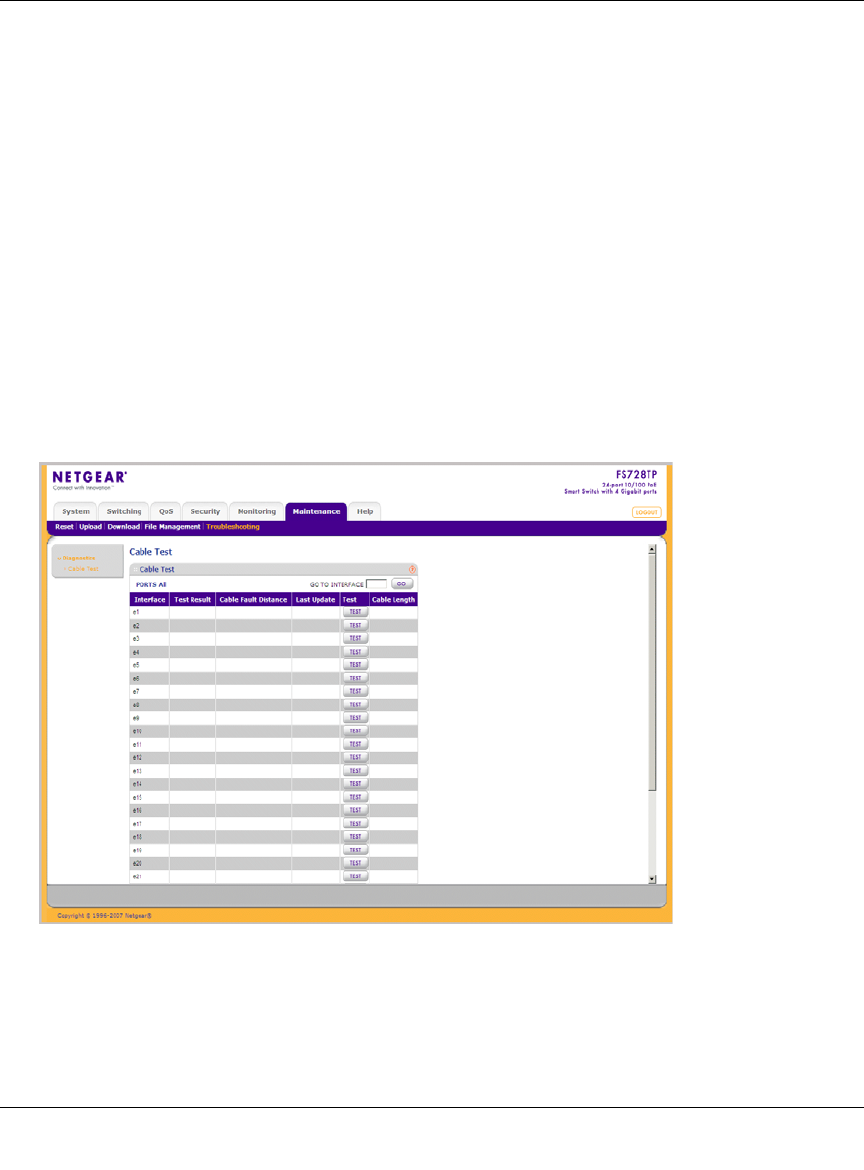 1. Click Maintenance > Troubleshooting > Cable Test. The Cable Test screen displays:
