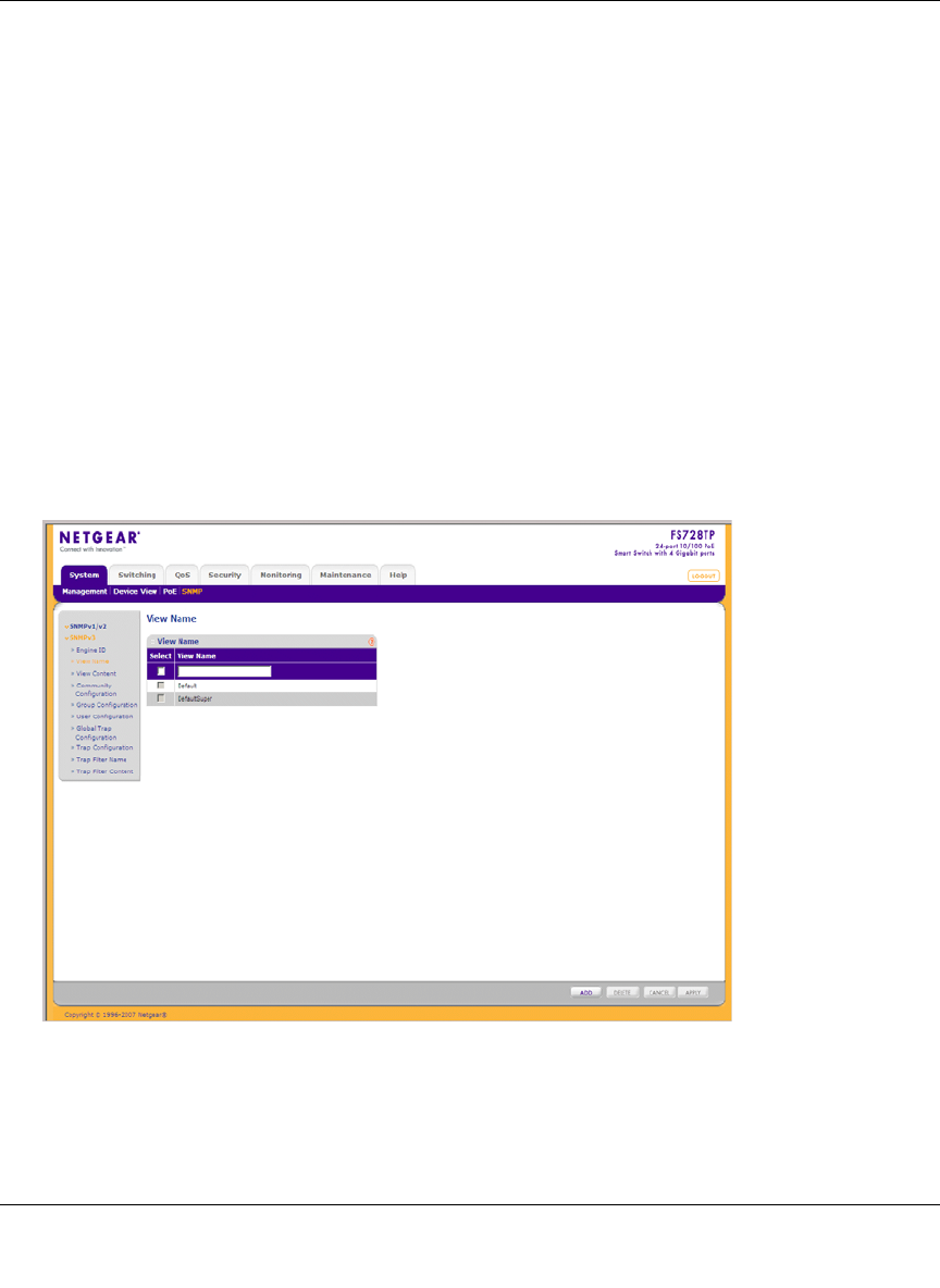 The SNMPv3 View Name screen allows network managers to define SNMPv3 View Names.