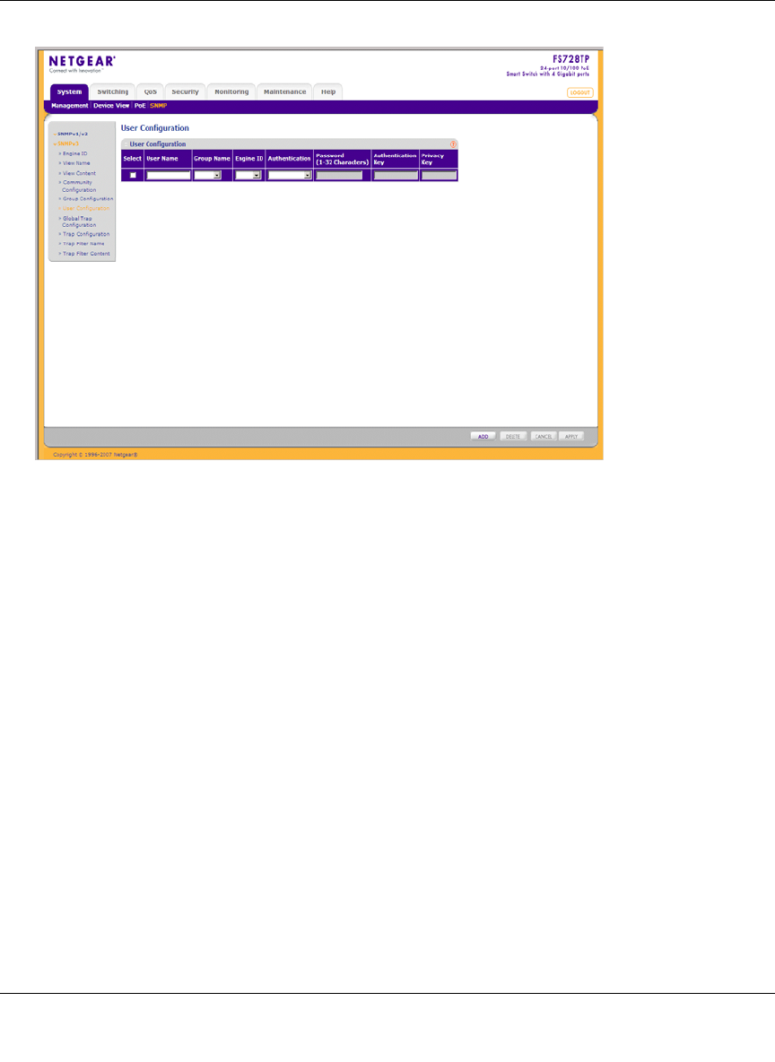 • Engine ID – Select either the local or remote SNMP entity to which the user is connected.