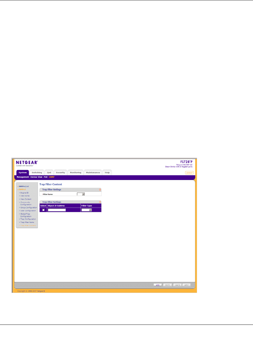 1. Click System > SNMP > SNMPv3 > Trap Filter Content. The SNMPv3 Trap Filter Content
