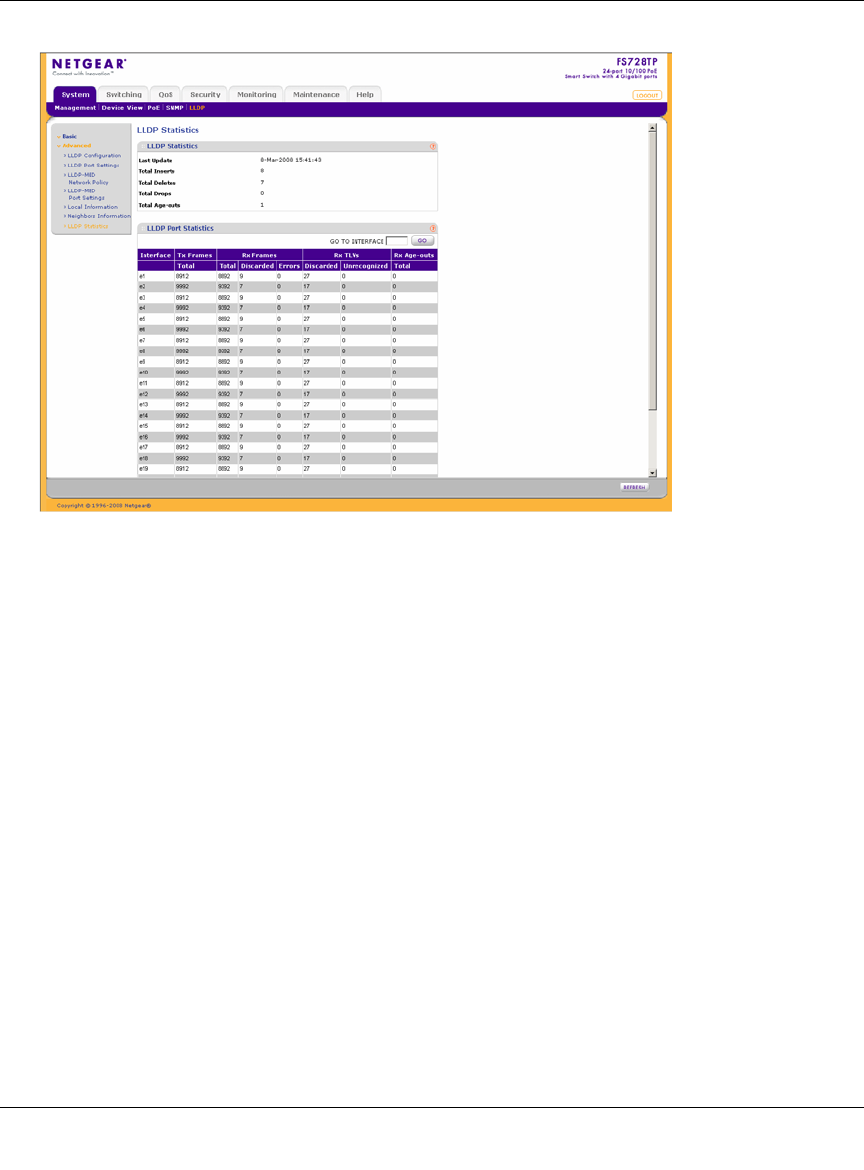 • Interface – Indicates the stacking member for which the LLDP statistics are displayed.