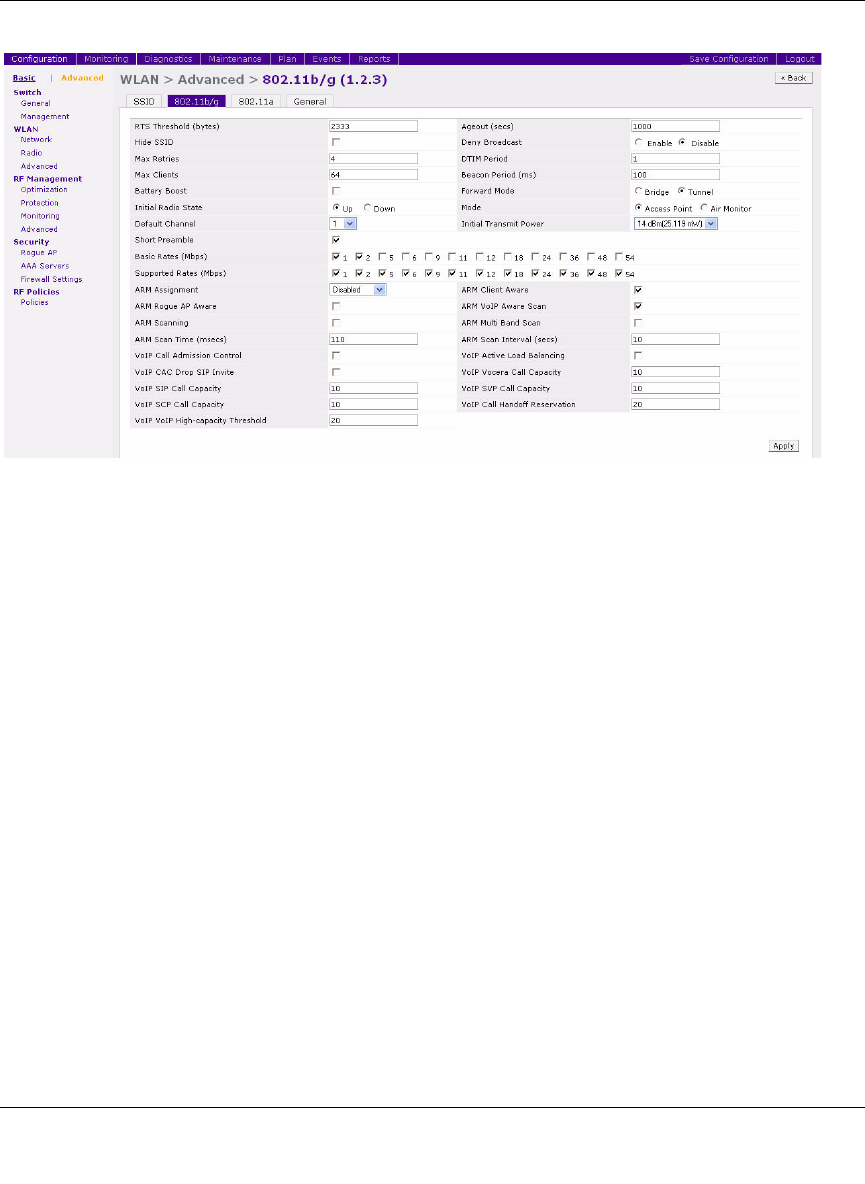 The radio configuration in the Advanced WLAN pages allow you to configure the following
