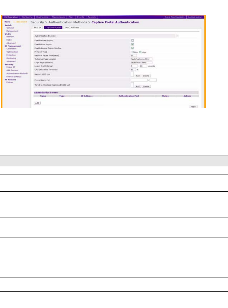 Enable Guest Logon Enables Captive Portal logon without authentication. Disabled