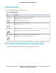 AC1200 WiFi Router Model R6120 LED Descriptions The following table describes the LEDs on the router. Table 2. LED descriptions LED Description Power LED Solid green. The power is on, and the router is ready. Blinking green. A firmware update is in progress. Off. Power is not supplied to the router. WiFi LED Solid green. The wireless radio is operating. Off. The wireless radio is off. Internet LED Solid green. The Internet connection is ready. Off.