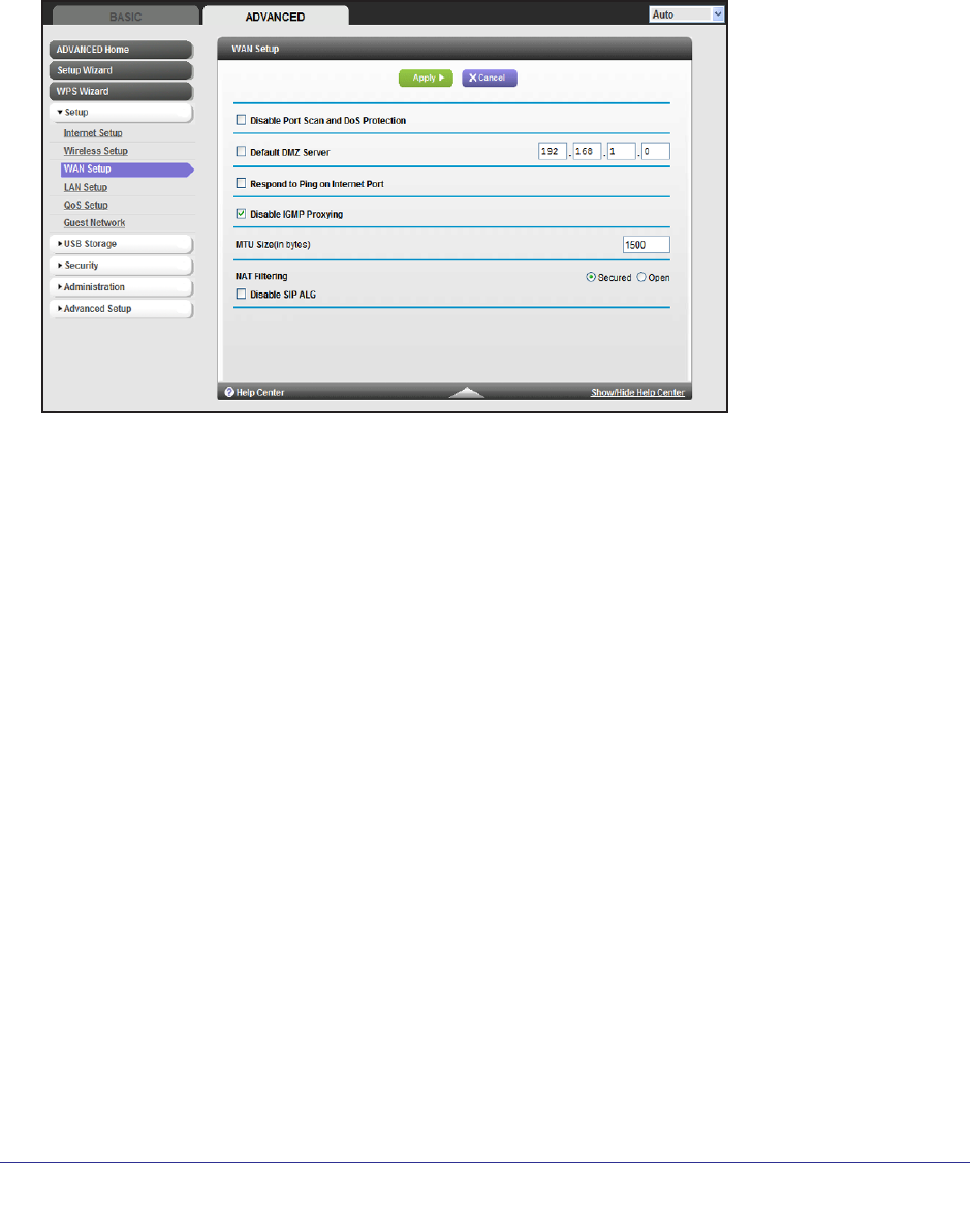 (Internet) port. Select Advanced > Setup > WAN Setup to view the following screen: