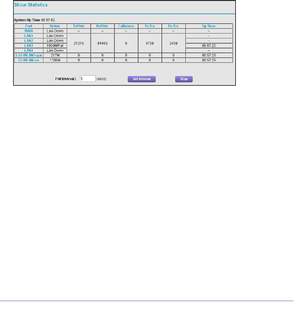 Port. The statistics for the WAN (Internet) and LAN (Ethernet) ports. For each port, the