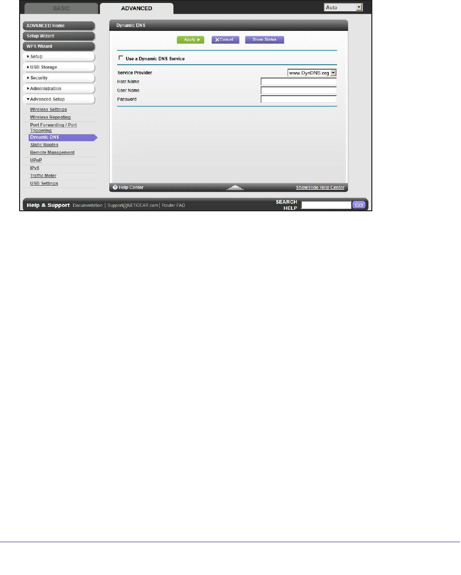 On the Advanced tab, select Advanced Setup > Dynamic DNS to display the following