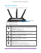 Nighthawk AC1900 Smart WiFi Router Model R7000 Table 1. LED and button descriptions (Continued) LED Description Ethernet ports 1-4 The LED color indicates the speed: white for Gigabit Ethernet connections and amber for 100 Mbps or 10 Mbps Ethernet connections. • Solid. A powered-on device is connected to the Ethernet port. • Blinking. The port is sending or receiving traffic. • Off. No device is connected to this Ethernet port. WiFi On/Off Pressing this button for two seconds turns the 2.