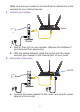 Make sure that your modem is turned off and is cabled only to the wall jack for your Internet service. 3. Connect your modem. Router Modem a. Plug in, then turn on your modem. (Replace the batteries if you removed them previously.) b. With the yellow Ethernet cable that came with the router, connect your modem to the Internet port of your router. 4. Add power to the router. On/Off a. Connect the power adapter to the router, and plug the power adapter into an outlet.