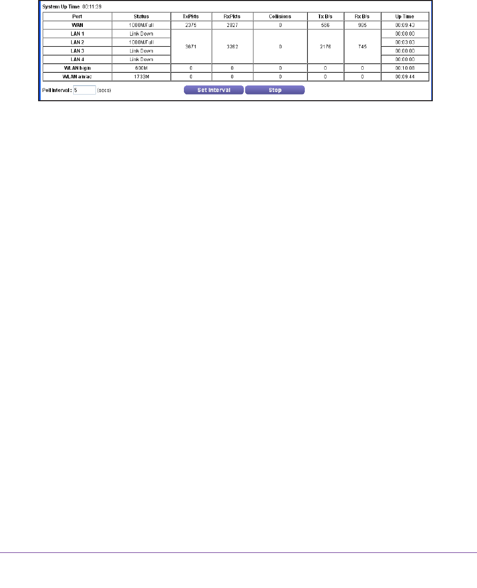 The statistics for the WAN (Internet) and LAN (Ethernet) ports. For each port,