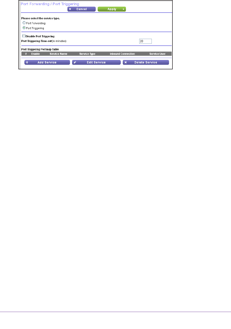 If this check box is selected, the router does not use port triggering even if you specified