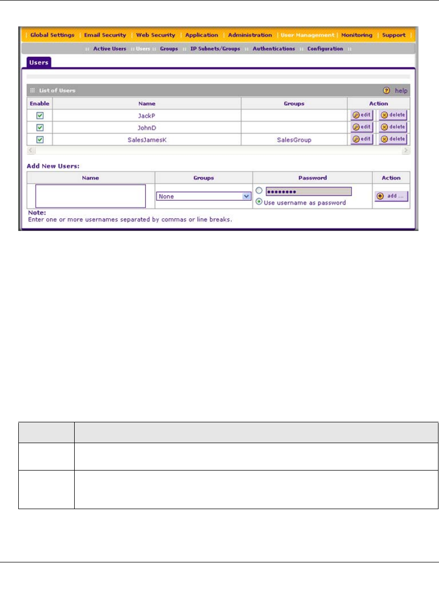 • Action. The edit table button that provides access to the Edit User screen and the delete