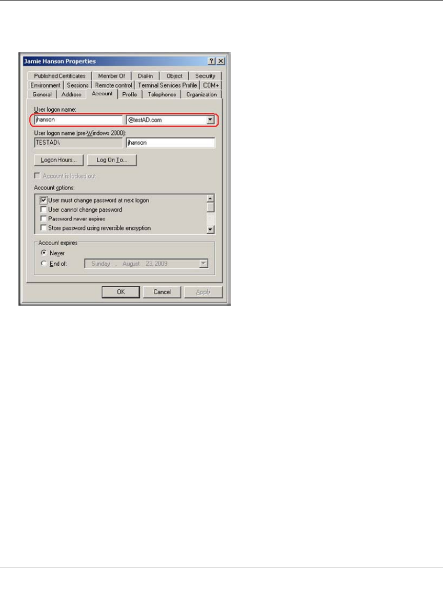 4. To verify Jamie Hanson’s user logon name, click the Account tab. The account properties for