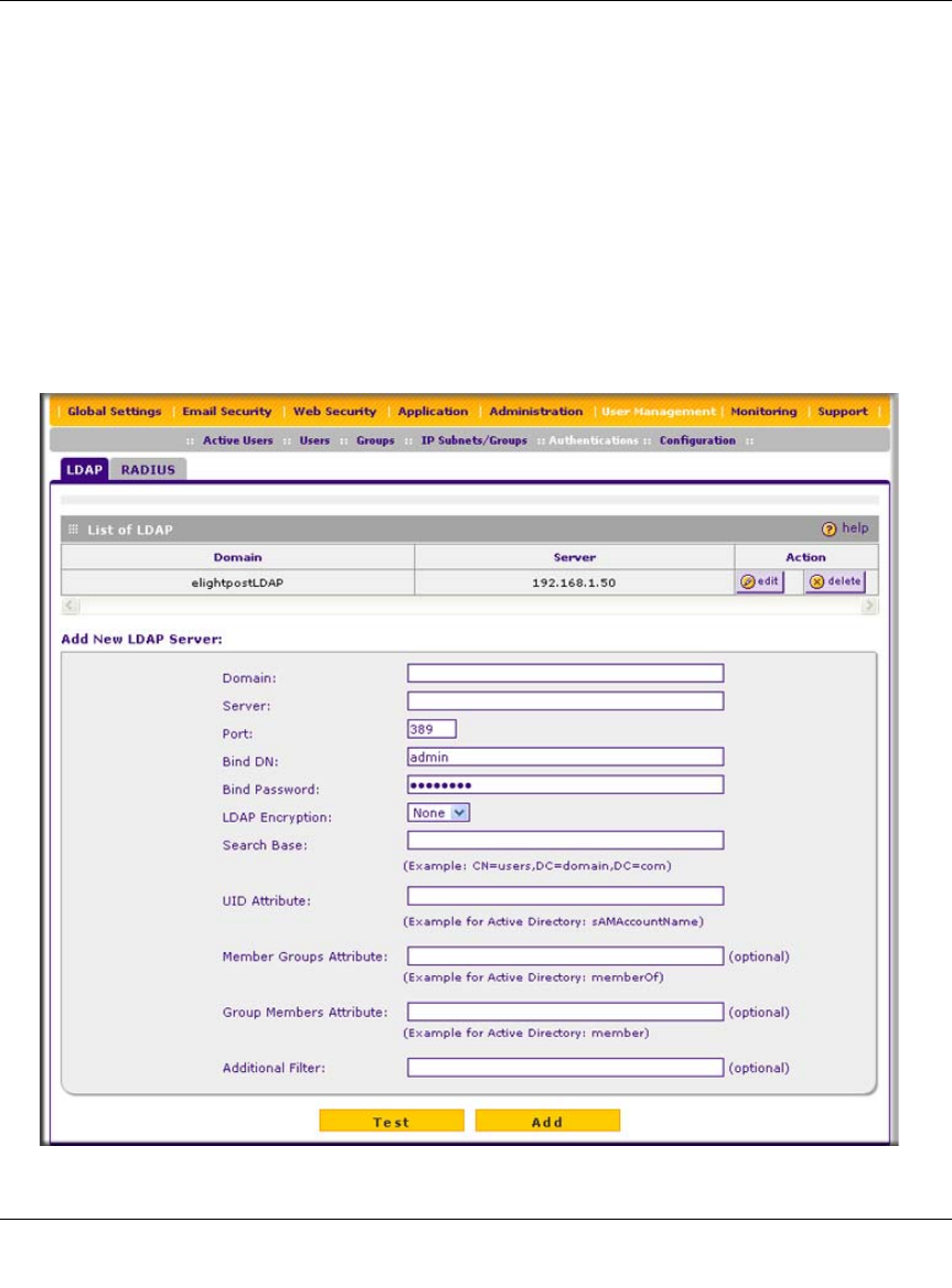 9. Click Test to verify that the LDAP server can actually function with the bind DN that you have