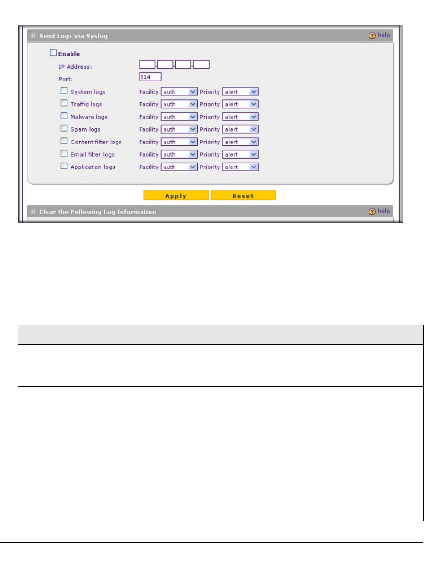 Logs Select the checkboxes to specify which logs are sent to the syslog server: