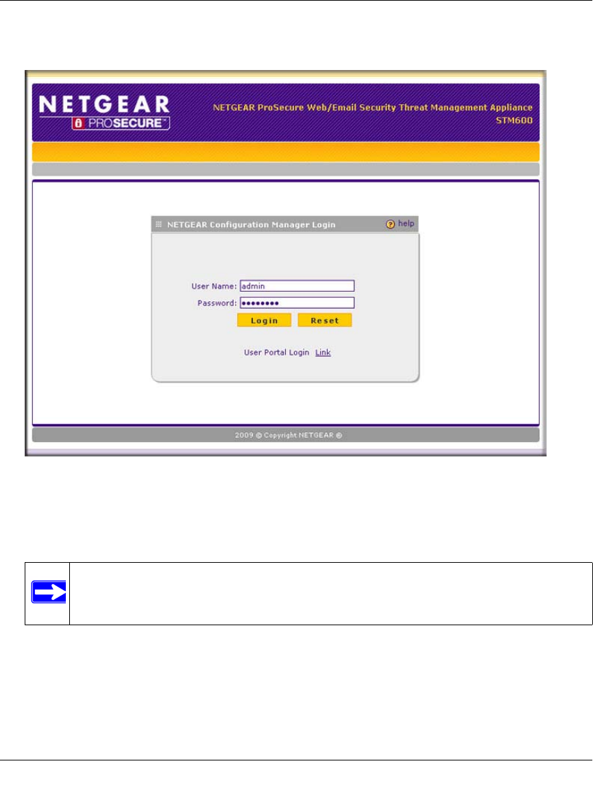 The NETGEAR Configuration Manager Login screen displays in the browser (see Figure 2-4,