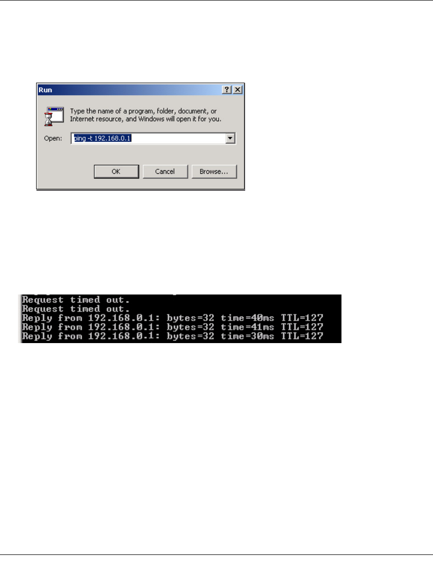 b. Assuming the target PC is configured with 192.168.0.1 as its IP address, type ping -t