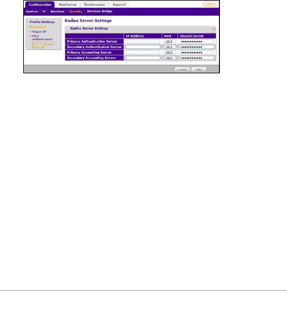 1. Select Configuration > Security > Advanced > RADIUS Server Settings. The