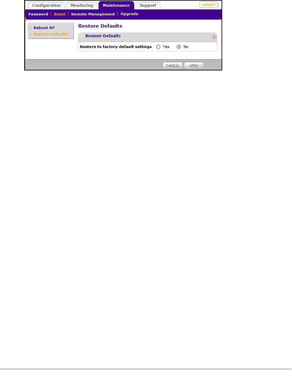 1. Select Maintenance > Reset > Restore Defaults. The Restore Defaults screen
