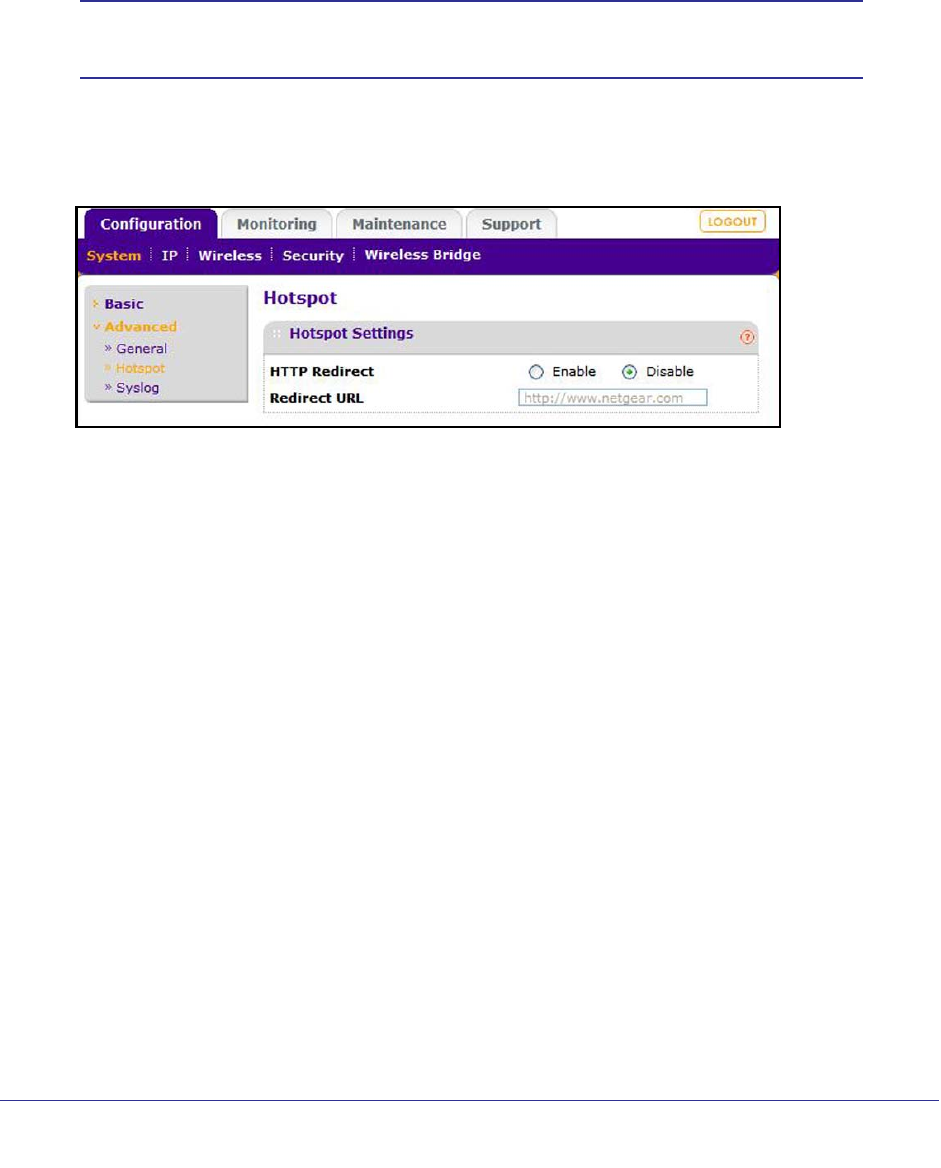 1. Select Configuration > System > Advanced > Hotspot. The Hotspot screen displays: