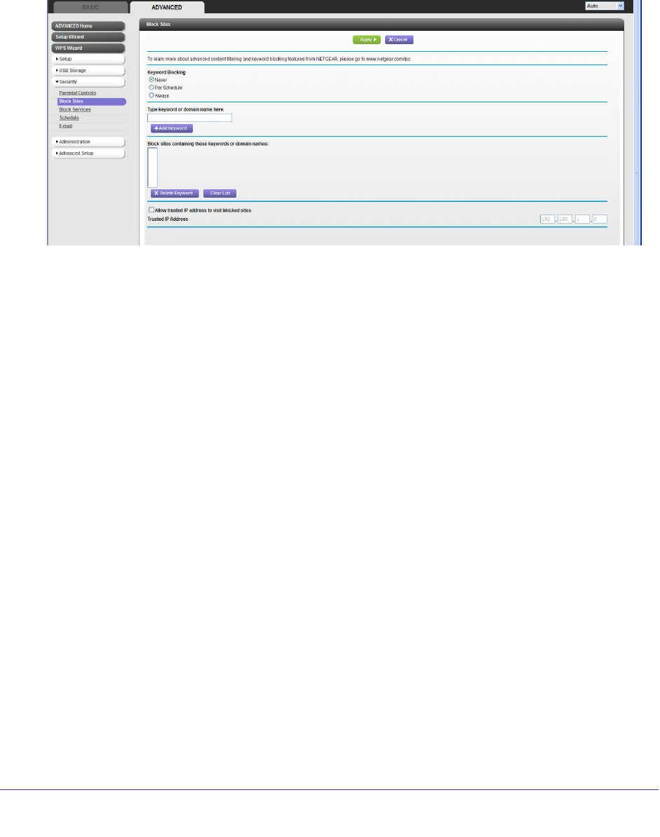 1. Select Advanced > Security > Block Sites to display the following screen: