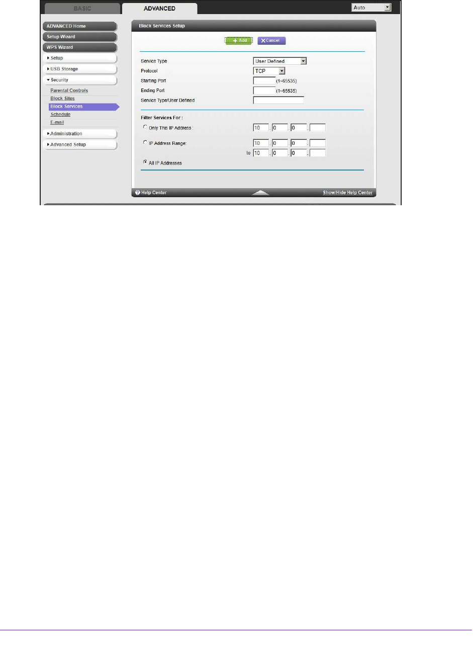 3. Click Add to add a service. The Block Services Setup screen displays: