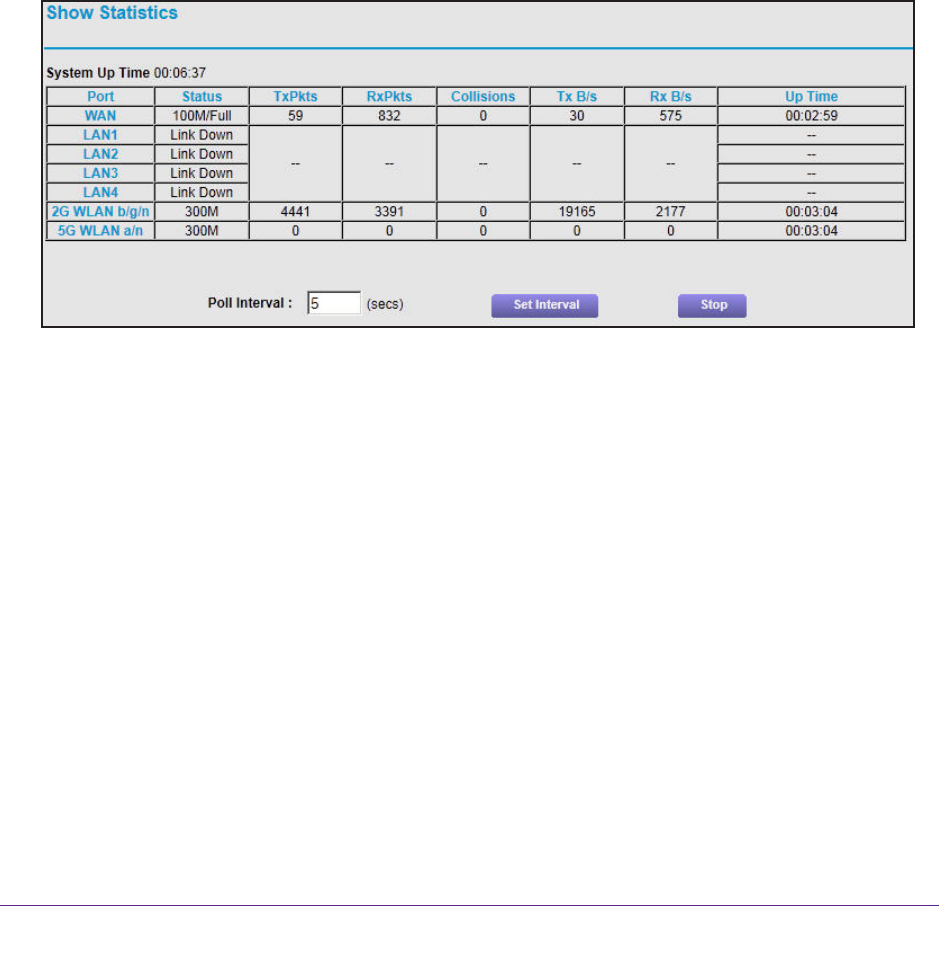 The statistics for the WAN (Internet) and LAN (Ethernet) ports. For each port, the