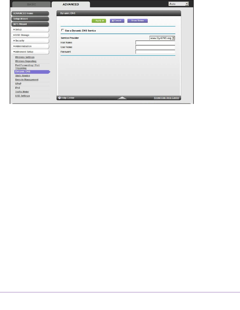 On the Advanced tab, select Advanced Setup > Dynamic DNS to display the following