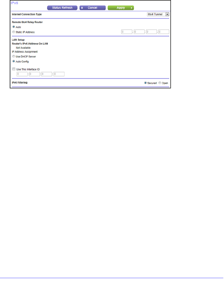 In the IPv6 screen, when you select 6to4 Tunnel from the drop-down list, the following