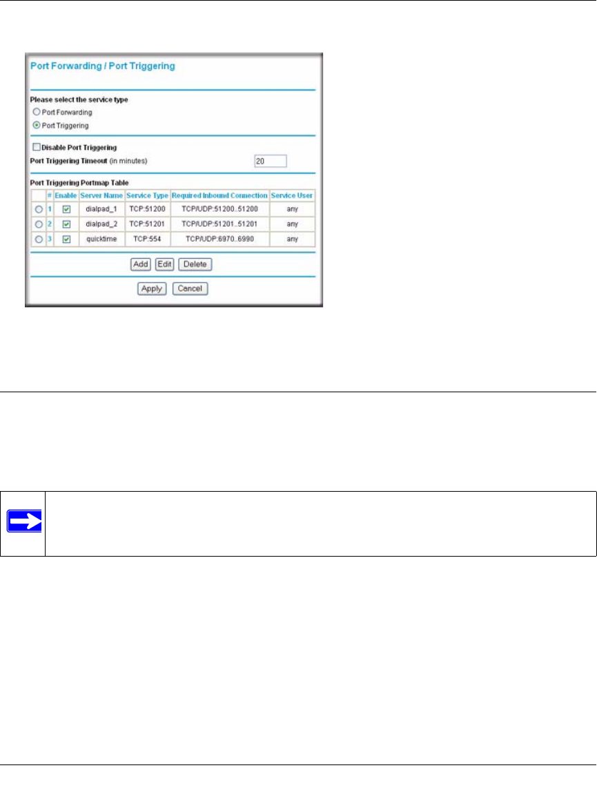 11. Click Apply. The service appears in the Port Triggering Portmap table.