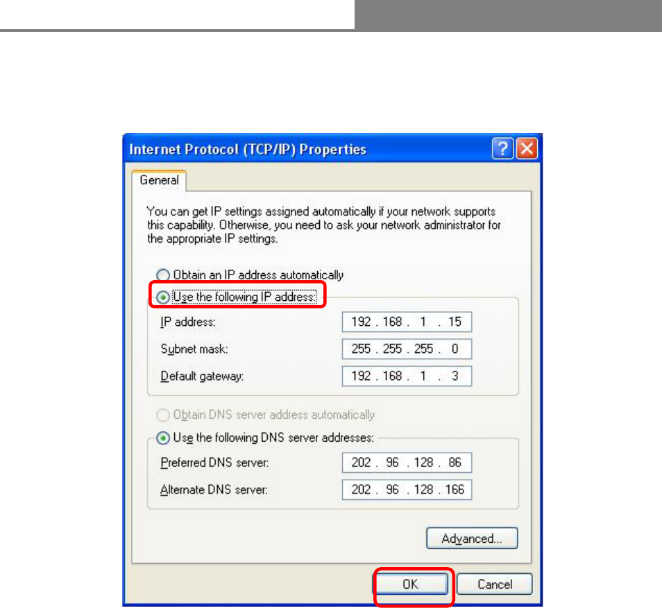 configuration. Choose “Use the following IP address” to specify IP addresses manually. Please