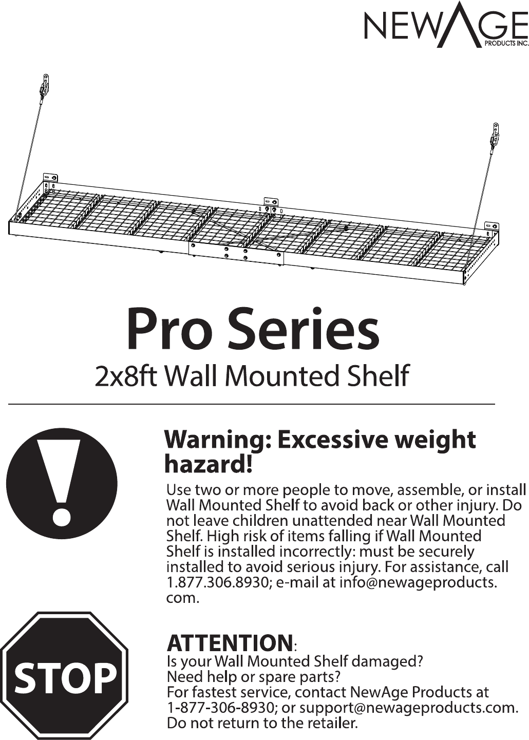 Pro Series 2x8ft Wall Mounted Shelf Warning: Excessive weight hazard! Use two or more people to move, assemble, or install Wall Mounted Shelf to avoid back or other injury. Do not leave children unattended near Wall Mounted Shelf, High risk of items falling if Wall Mounted Shelf is installed incorrectly: must be securely installed to avoid serious injury. For assistance, call 1.877.306.8930; e-mail at counterproductive.