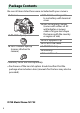 Package Contents Be sure all items listed here were included with your camera. ❏ Camera ❏ BF-1B body cap ❏ DK-31 rubber eyecup (comes attached to camera) ❏ EN-EL15b rechargeable Li-ion battery with terminal cover ❏ MH-25a battery charger (comes with either an AC wall adapter or power cable of a type and shape that varies with the country or region of sale) ❏ DK-5 eyepiece cap ❏ UC-E24 USB cable ❏ AN-DC21 strap ❏ Warranty ❏ User’s Manual • Memory cards are sold separately.