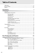 XIntroduction X This chapter covers information you will need to know before using the camera, including the names of camera parts, how to use the camera menus, and how to ready the camera for use. Overview ......................................................................................................................... 2 Getting to Know the Camera....................................................................................... 3 The Camera Body...........................................