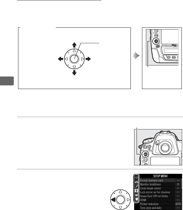 The multi selector and J button are used to navigate the menus.
