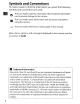 Symbols and Conventions • To make it easier to find the information you need, the following symbols and conventions are used: ~ This icon marks cautions; information that should be read before use to prevent damage to the camera. This icon marks notes; information that should be read before using the camera. o This icon marks references to other pages in this manual. Menu items, options, and messages displayed in the camera monitor are shown in bold.