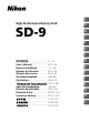 Preparation En Thank you for purchasing the Nikon High-performance Battery Pack SD-9. The SD-9 is an external power source for the Nikon Speedlight SB-900. You can install four or eight AA-type batteries in the SD-9 to ensure a stable power supply for the SB-900, and can get a greatly increased number of flashes and a shortened recycling time. Please read this user’s manual as well as the manuals provided with your camera and Speedlight before use.