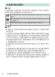 D 메모리 카드 • 사용한 메모리 카드는 뜨거울 수 있습니다. 카메라에서 메모리 카드를 꺼낼 때 주 의하십시오. • 포 맷 하 거 나 데 이 터 를 기 록, 삭 제 또 는 컴 퓨 터 또 는 기 타 장 치 에 복 사 하 는 동 안 에 는 다음 작업을 수행하지 마십시오. 이 주의 사항을 지키지 않으면 데이터를 잃거나 카메라나 메모리 카드가 손상될 수 있습니다. - 메모리 카드를 제거하거나 삽입하지 말 것 카메라 전원을 끄지 말 것 배터리를 제거하지 말 것 AC 어 댑 터 를 분 리 하 지 말 것 • 단자부를 손가락으로 만지거나 금속 물체로 건드리지 마십시오. • 메모리 카드를 다룰 때 무리하게 힘을 가하지 마십시오. 이 주의 사항을 지키지 않 으면 카드가 손상될 수 있습니다. • 메모리 카드를 구부리거나 떨어뜨리거나 강한 물리적 충격을 주지 마십시오. • 메모리 카드를 물, 열 또는 직사광선에 노출하지 마십시오. • 컴퓨터에서 메모리 카드를 포맷하지 마십시오.