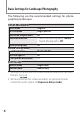 Basic Settings for Landscape Photography The following are the recommended settings for photographing landscapes: Photo shooting menu Focus mode AF-area mode Diffraction compensation Vibration reduction Single AF Single-point AF On • Hand-held photography: Normal • Tripod photography: Off 1 On Silent photography Custom Settings menu Shutter/AF-ON a6 AF activation a10 Low-light AF On d4 Exposure delay mode 1 s2 Other settings Release mode Single frame Monitor mode Monitor only 1.