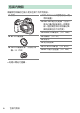 20 19 18 1 2 3 4 5 6 7 8 9 10 17 16 15 14 13 12 11 1 2 3 4 5 6 7 8 9 10 11 屈光度調節控制器 (0 13) DISP 按鍵 (0 25) 相片 / 短片選擇器 (0 56、63) AF-ON 按鍵 (0 28) 副選擇器 (0 27、133) i 按鍵 (0 33、136) 記憶卡插槽蓋 (0 45) 記憶卡存取指示燈 (0 61、65) J 按鍵 (0 29) 多重選擇器 (0 29) G 按鍵 (0 28、212) 12 c (E)按鍵 (0 125、131) 13 W (Q)按鍵 (0 27、32、 181、204) 14 X 按鍵 (0 27、91、181、 204) 15 螢幕 (0 19、88) 16 O 按鍵 (0 72、206) 17 K 按鍵 (0 69、180) 18 橡膠眼罩 (0 704) 19 觀景器 (0 13) 20 眼睛感應器 (0 13) 相機部件 3