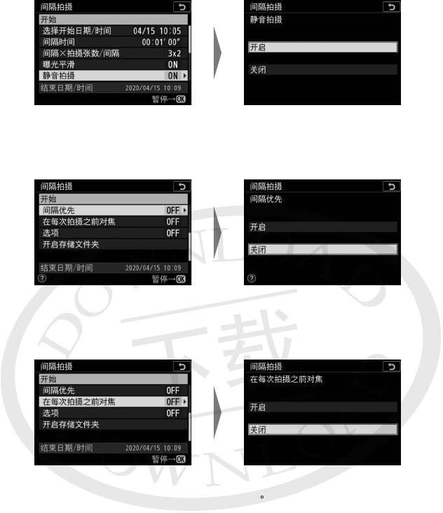 选择照相机在两次拍摄之间是否对焦。