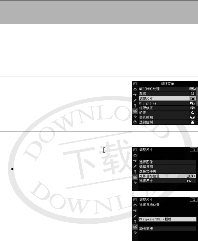 创建所选照片的小型副本。若插有两张存储卡,您可选择用于存储调整