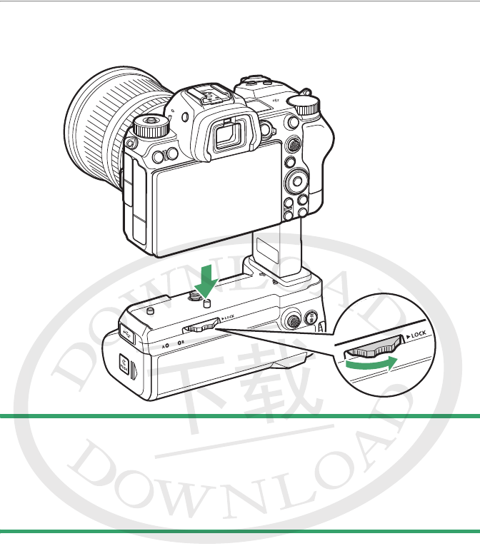 箭头所示的方向旋转锁定螺旋钮将电池匣固定到位。