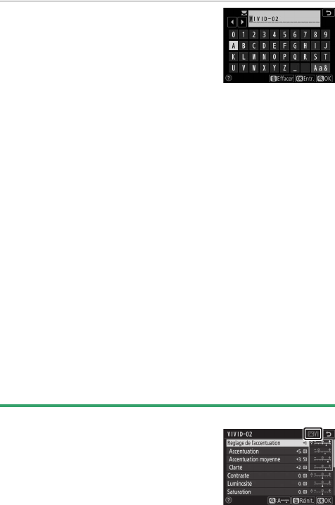 de Picture Control, reportez-vous à « Saisie de texte »