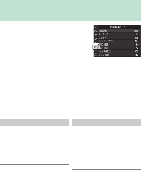 画像編集メニューでは、メモリーカード内の撮影済み画像を編集するこ