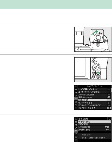 お使いになる前に次の手順で場所と日時を設定してください。